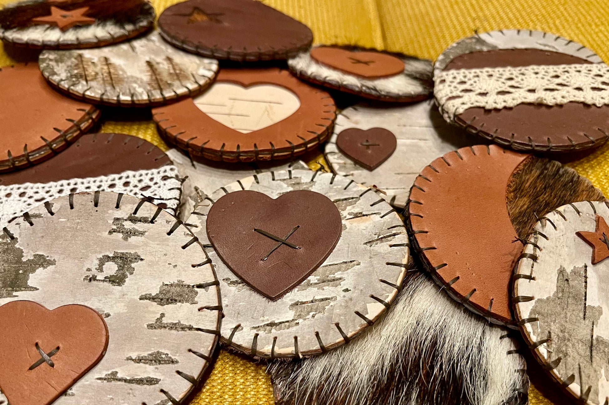 Leather - cow , hair on cow hide , birch bark